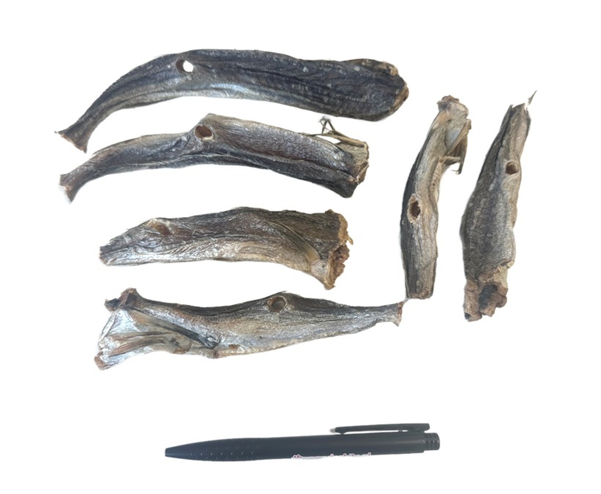 aardig maatje vis. Kop is wat groter/dikker dan het lijf. Mijn senioren standaard labradoodles vinden ze erg lekker. Dit is ook nog goed te bijten voor ze.